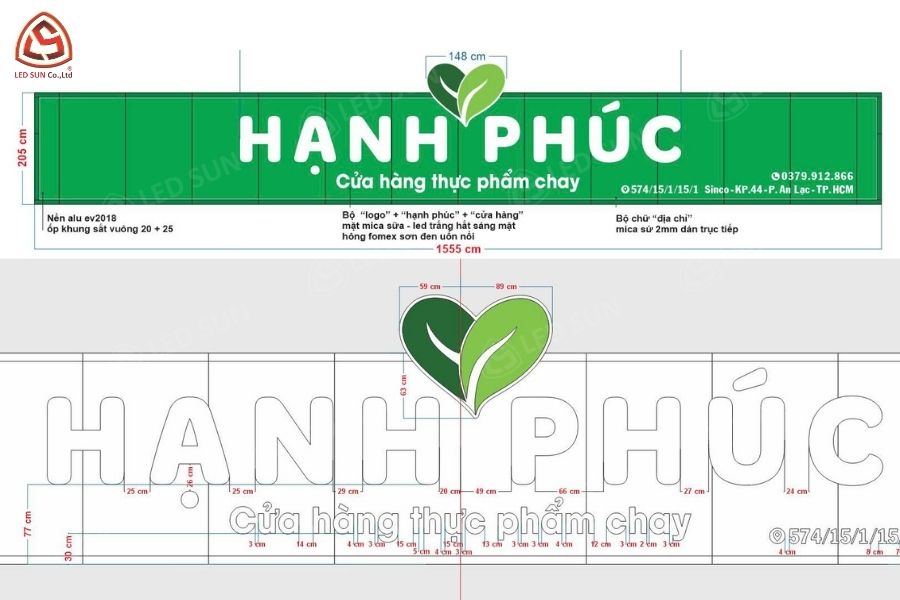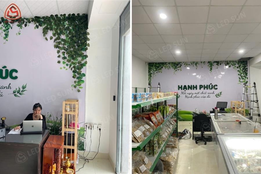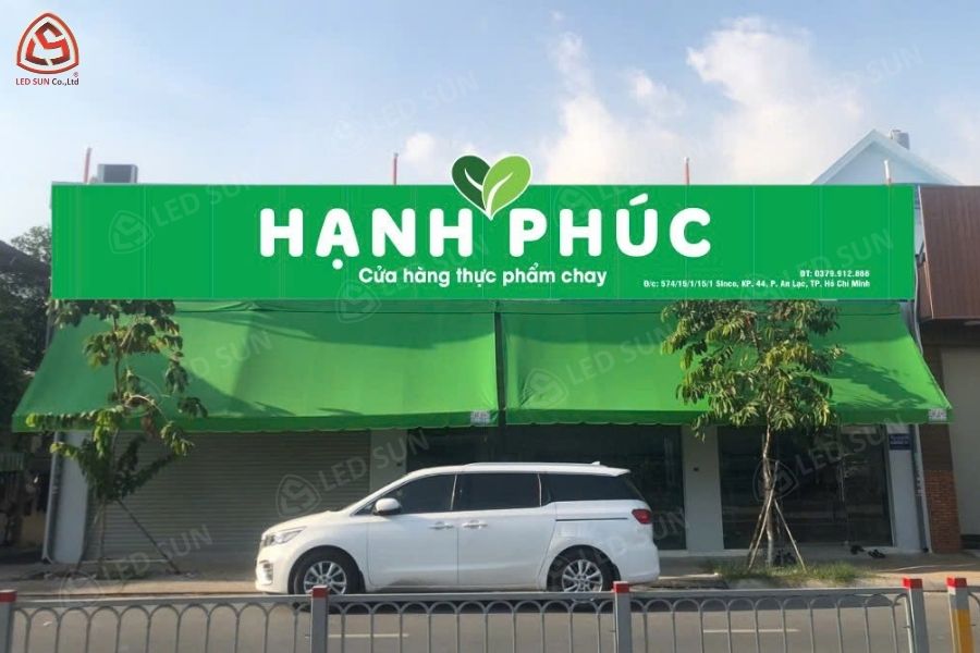 Led Sun thực hiện thiết kế, sản xuất và thi công bảng hiệu tại Quận Bình Tân cho cửa hàng thực phẩm chay Hạnh Phúc ở TP.HCM. Công trình bao gồm bảng hiệu mặt tiền sử dụng nền alu kết hợp hệ thống chữ nổi phát sáng và backdrop trang trí bên trong cửa hàng.