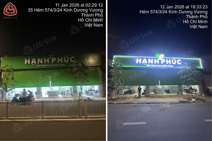 Sau khi hoàn thiện, bảng hiệu giúp cửa hàng thực phẩm chay Hạnh Phúc trở nên nổi bật hơn trên tuyến đường khu vực Bình Tân. Hệ thống chữ nổi phát sáng và logo mầm xanh tạo cảm giác thân thiện, phù hợp với hình ảnh thương hiệu thực phẩm chay.