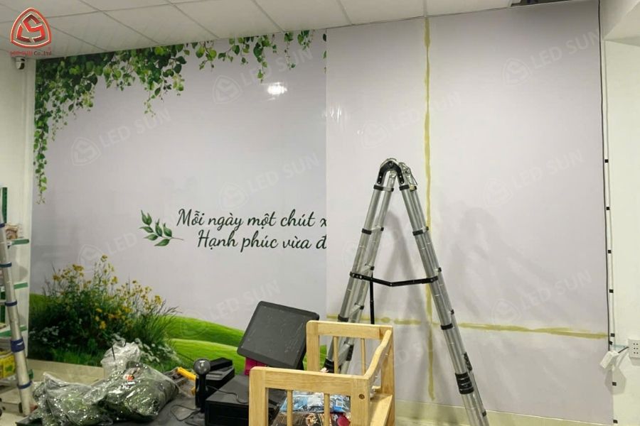Bên trong cửa hàng, khu vực backdrop được thiết kế với nền decal cán fomex kết hợp logo và bộ chữ nổi nhằm tạo điểm nhấn trang trí cho không gian.