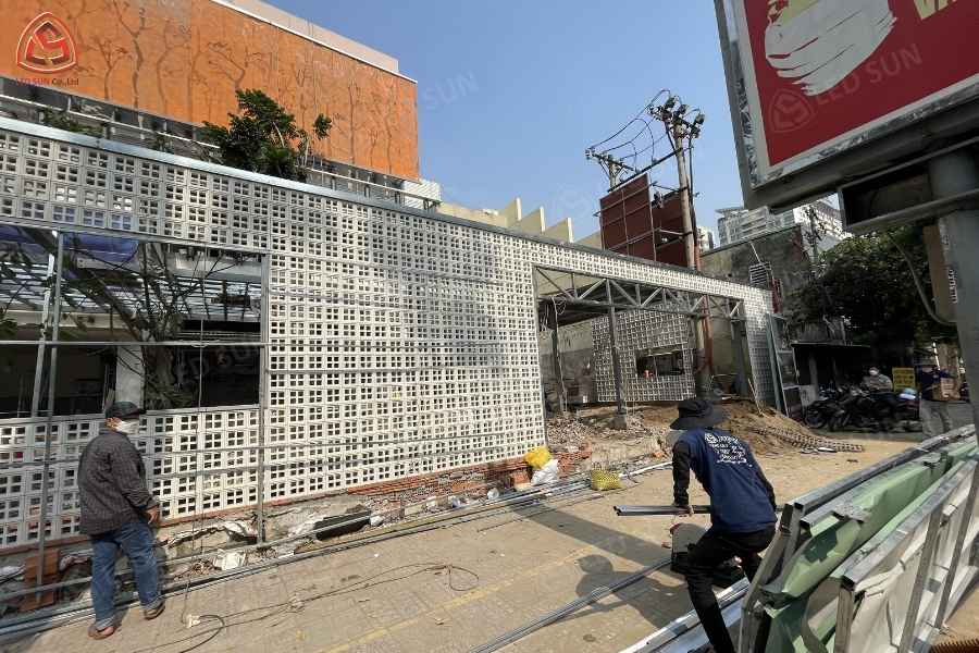 Led Sun triển khai thi công hệ thống bảng hiệu chữ nổi inox phát sáng kết hợp trang trí mặt dựng bằng alu. Thiết kế mặt dựng sử dụng các tấm alu được sắp xếp theo dạng caro chồng chéo, tạo hiệu ứng thẩm mỹ cho mặt tường.