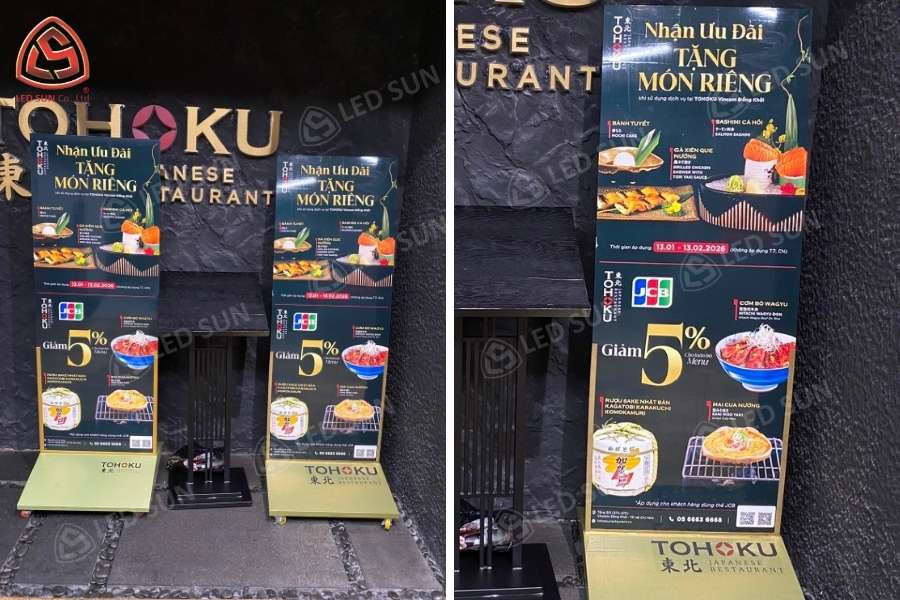 Biển bạt 2 mặt có chân là một loại biển quảng cáo phổ biến, thường được sử dụng trước các cửa hàng, quán ăn, tiệm tóc, tiệm tạp hóa,… với mục đích thu hút sự chú ý từ cả hai hướng người đi đường.