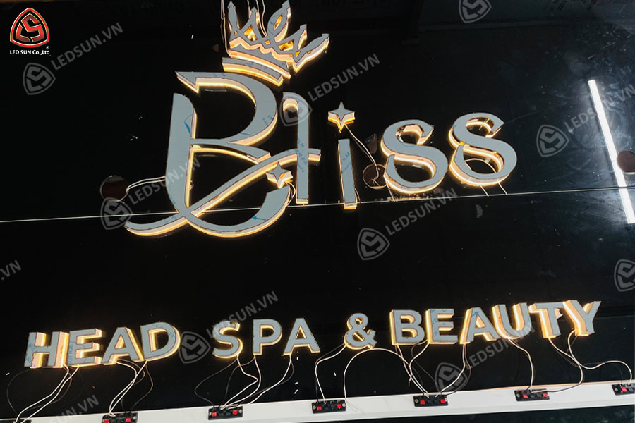 Mặt chữ inox vàng gương: Được làm từ inox cao cấp có bề mặt sáng bóng như gương, màu vàng sang trọng, giúp tạo hiệu ứng phản chiếu đẹp mắt và tăng sự nổi bật cho bảng hiệu.